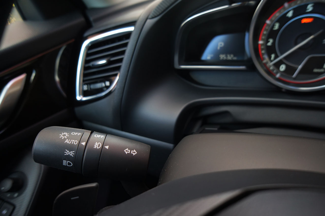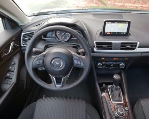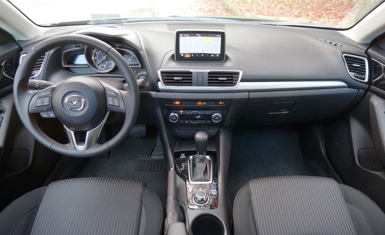 you like the new CX-5 compact crossover utility and Mazda6 midsize sedan, you should feel much the same about the compact Mazda3. Like in previous years, it comes in four-door sedan and five-door hatchback body styles, the latter dubbed Sport here in Canada. My Sport came in top-tier GT trim, which means its stylish new headlights get bi-xenon beams while attractive 18-inch alloys inside 215/45 all-seasons round out the bottom half of the design. The aforementioned heads-up display is included in GT trim too, as is navigation within the infotainment system, plus proximity sensing access with pushbutton ignition, dual-zone automatic climate control, as well as paddle-shifters to actuate the new standard six-speed automatic transmission; the six-speed manual available with the base GX and mid-grade GS can’t be had with the sportiest GT model. Go figure?