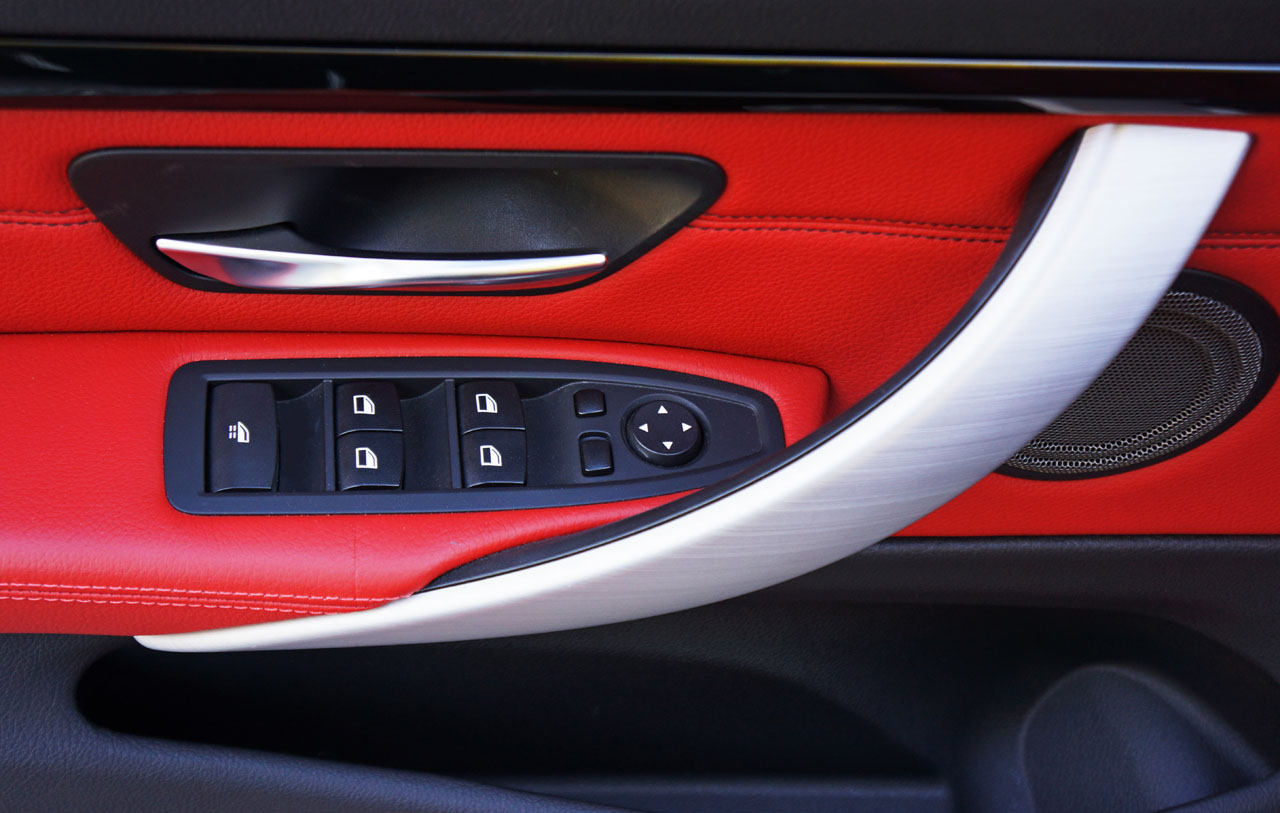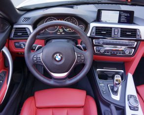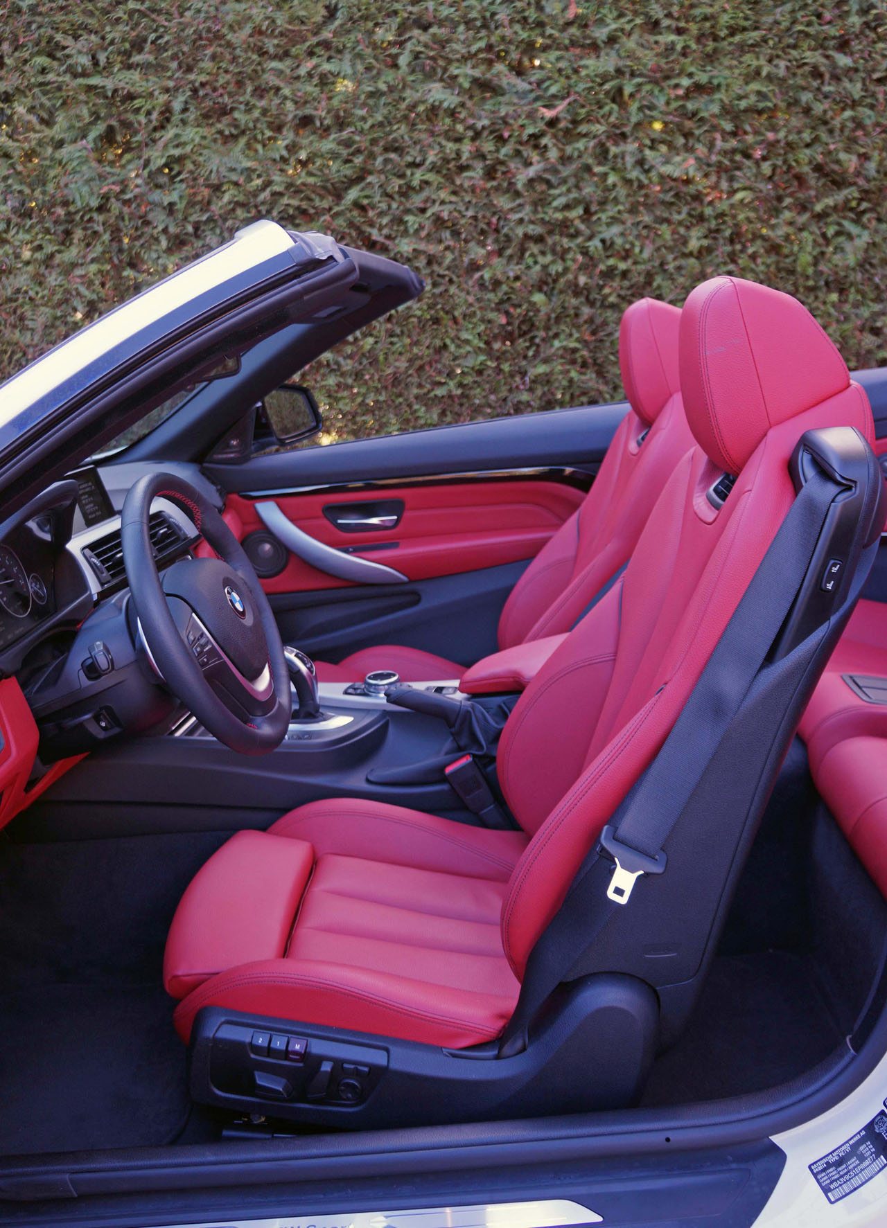 very pretty combination, white being the new silver amongst today’s luxury set and the deep classic Coral Red Dakota hides in my tester always fashionable within a car bearing the blue and white roundel. My particular example rode on a stock set of 18-inch double spoke alloys shod in 225/45R18 Pirelli Cinturato P7 runflats, a good tire for providing the performance expected in a BMW and comfort needed in this model’s more luxury-focused trim. Speaking of trim, BMW kept the interior accents stock, which is to my liking as the finely brushed aluminum added to the sophisticated look, a nice complement to the Coral Red lower dash and door inserts, as well as the sporty red stitching on the steering wheel. The seats were stitched in black, providing the perfect contrast to their red leather. All in all my 4 Series Cab looked even grander than the sixty-plus grand needed to purchase it.