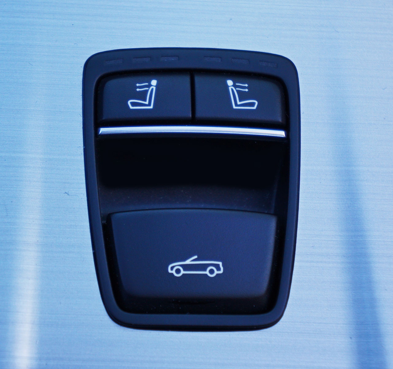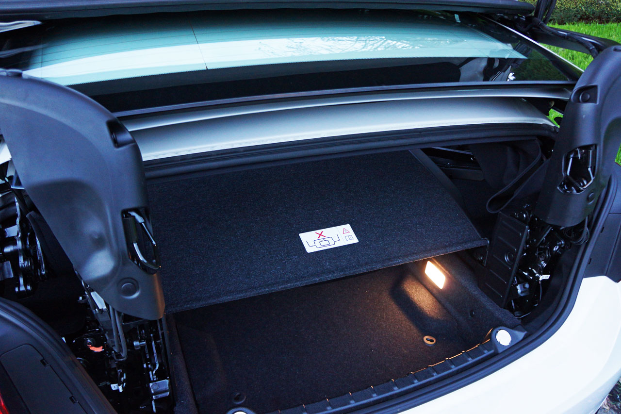 aluminum (and glass) panels consume a significant percentage of that cargo hold, resulting in a mere 230 litres remaining, not to mention a rather small gap to wiggle things through in order to get them in and out. Or at least that’s how it looks at first glance. Press and hold a switch on the underside of the trunk lid and it powers up about a foot higher, after which the three roof panels follow suit, thus allowing you to lift up the trunk divider and access your gear. Loading can be done the same way in reverse.
