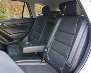 a fold-down rear seat centre armrest with integrated cupholders, an alarm, blind-spot monitoring, and truly convenient 40/20/40 split-folding rear seatbacks that can be dropped via pull handles on the sidewalls of the cargo area, although unlike some in this class the headrests don’t automatically flip downward so you may have to pull the front seats forward to lay them flat. When they’re flat the CX-5 opens up to a sizable 1,852 litres (65.4 cubic feet) for 17 additional litres (0.6 more cubic feet) of cargo volume than the base model that only gets 60/40 split rear seatbacks, while both trims offer up 966 litres (34.1 cubic feet) of luggage space when all five seating positions are in use.