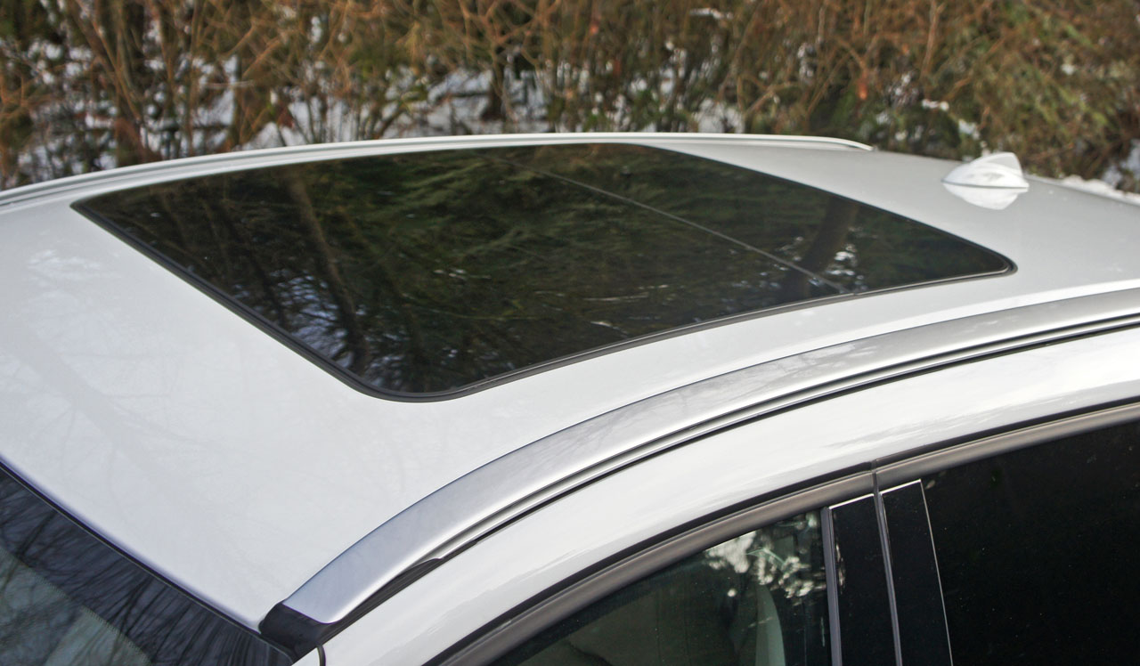 A quick rundown of standard features includes an electric parking brake, a tilt and telescopic leather-wrapped multifunction steering wheel, a leather-trimmed shift knob, power windows with auto up/down up front (the rear door windows really should be auto up/down too), heatable powered side mirrors, rain-sensing wipers, cruise control, an exterior temperature gauge, eight-way powered and heatable front seats with lumbar adjustment, three-position memory for the driver, T-Tec upholstery, brushed aluminum inlays, dual-zone automatic climate control with B-pillar