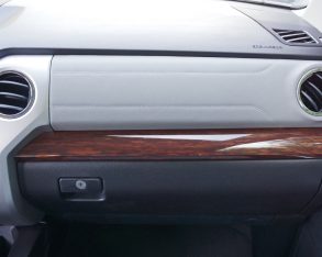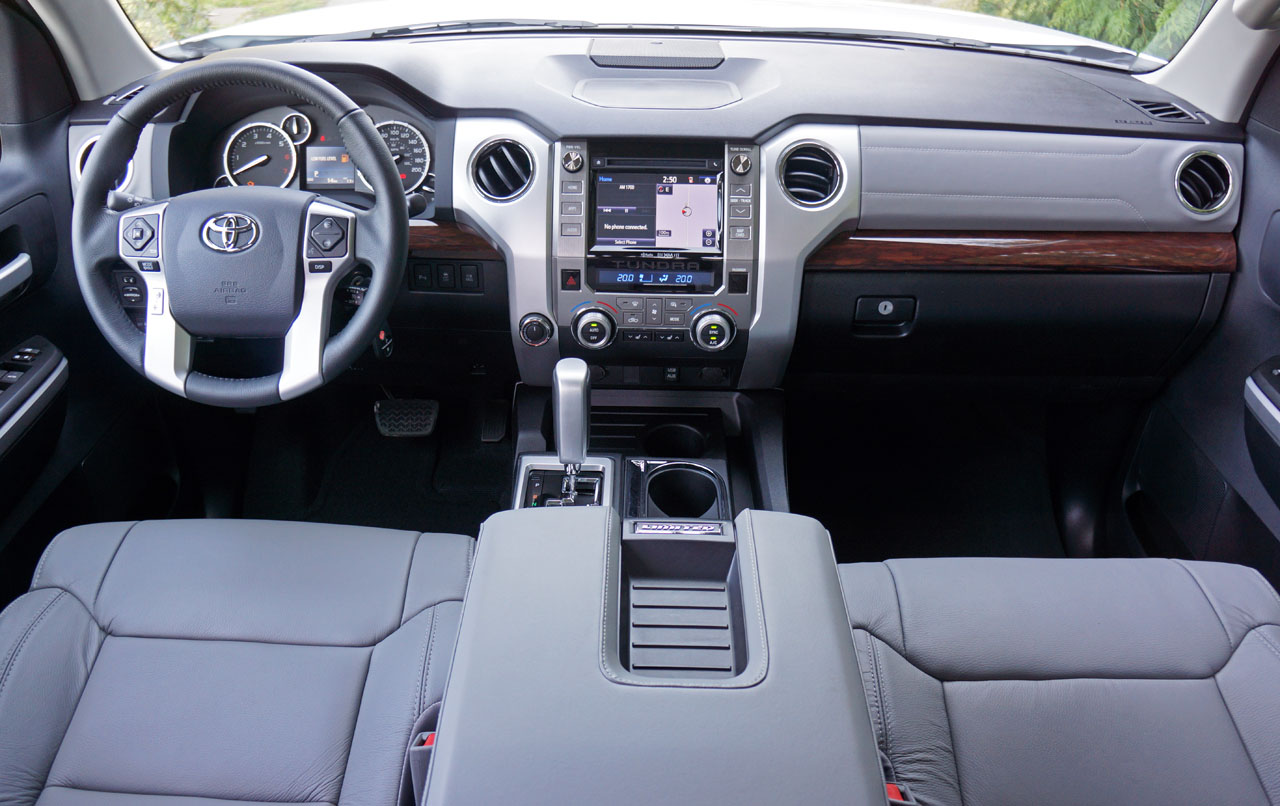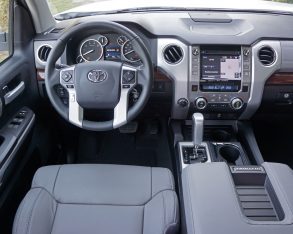 Some glossy faux woodgrain stretches across the IP just above the driver’s knees and just below that leatherette panel ahead of the front passenger, while Toyota adds artistic flair by directly mirroring the satin-silver aluminum-look steering wheel spokes on the centre stack, each side bookended by satin-silver garnishes identical in shape if not size. The Tundra Limited gets the same satin-silver treatment on the lower console and elsewhere in the cabin, while the surface surrounding the infotainment