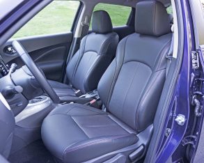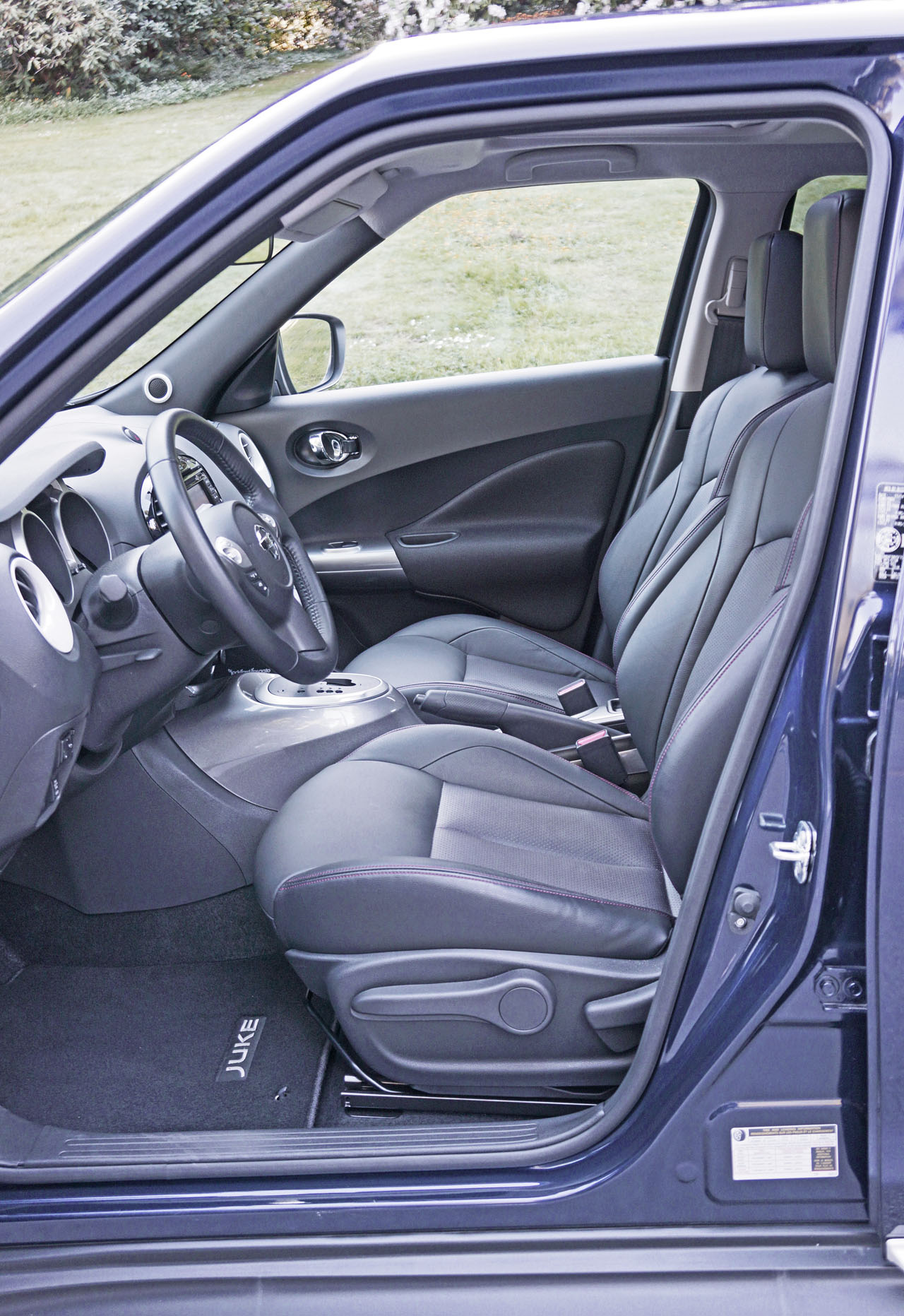 you off, the rest of the Juke interior is fairly common. My SL upgrade meant that a powered sliding glass sunroof made the cabin feel more open, while the base model’s leather-wrapped steering wheel was joined by a leather-wrapped shift knob and leather upholstery with red stitching, the latter complemented with heatable front cushions, all combining for a bit of upscale decadence.