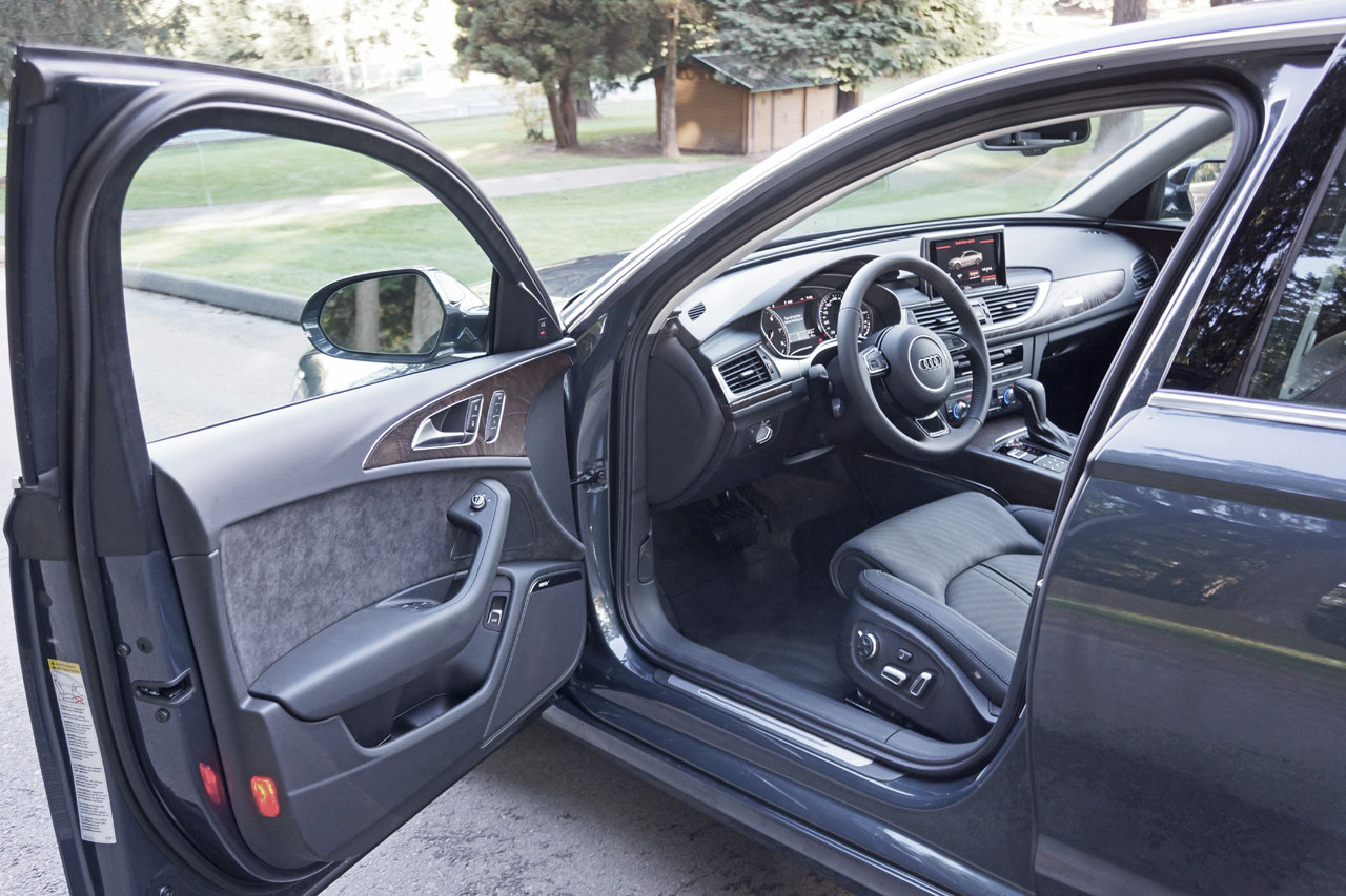 This is standard, incidentally, the base A6 2.0 TFSI Quattro Progressiv starting at just $56,900 plus freight and dealer fees while including a host of included gear that gets grandfathered up to my 3.0 TFSI Quattro Technik tester, such as auto on/off HID headlamps with automatic range adjustment, daytime running lights and washers, a powered moonroof, metal scuff plates, proximity-sensing keyless entry with pushbutton start/stop, an electromechanical parking brake, heatable powered front seats with powered lumbar support, heatable rear outboard seats, leather