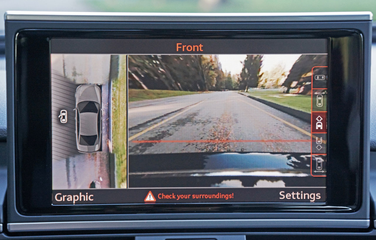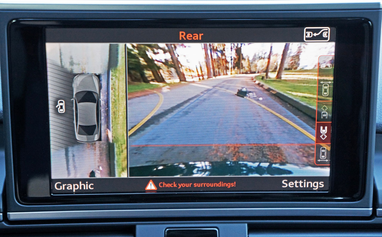 up to the 3.0-litre V6 increases the price to $63,700 and also adds the gorgeous natural fine grain ash wood inlays I mentioned before, plus a HomeLink universal garage door opener, while Technik trim, which pushed the window sticker of my test model up to a still reasonable $70,200, added the larger 19-inch wheels and tires I commented on earlier, plus the front seat ventilation and 360-degree camera also noted before, as well as power-folding side mirrors with memory, ambient interior lighting, upgraded multi-piece dash and door trim panels, absolutely superb 14-speaker 630-watt Bose surround sound audio with AudioPilot noise-compensation, four-way front lumbar support, a powered rear sunscreen, a powered trunk lid, Audi pre sense rear and side assist, and more.
