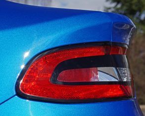 close to the model I tested, mine even featuring sportier exterior and interior styling plus a performance-tuned suspension. Dodge dubs it the Dart Blacktop, and no it didn’t come with a black convertible top, a black glass sunroof or even a smattering of black paint up on its roof, but rather its top was Laser Blue Pearl like the rest of its bodywork; at least everything was blue that wasn’t finished in glossy black. Yes, Dodge didn’t leave black paint off the Blacktop’s menu, instead using it for the crosshair grille, centre bumper cap and surround, small circular fog lamps with black “spears” and surrounds, 18-inch alloys on 225/40R18 Yokohama all-seasons, and the side mirror caps, these upgrades joining a strangely named $835 Mopar Dual Exhaust Exterior package that adds a matte black air splitter type front lip spoiler, identical looking aero trim on the rockers, and a particularly sporty rear diffuser. In case you were wondering how the dual exhaust portion of that name came to be, a sweet set of fat chrome-tipped