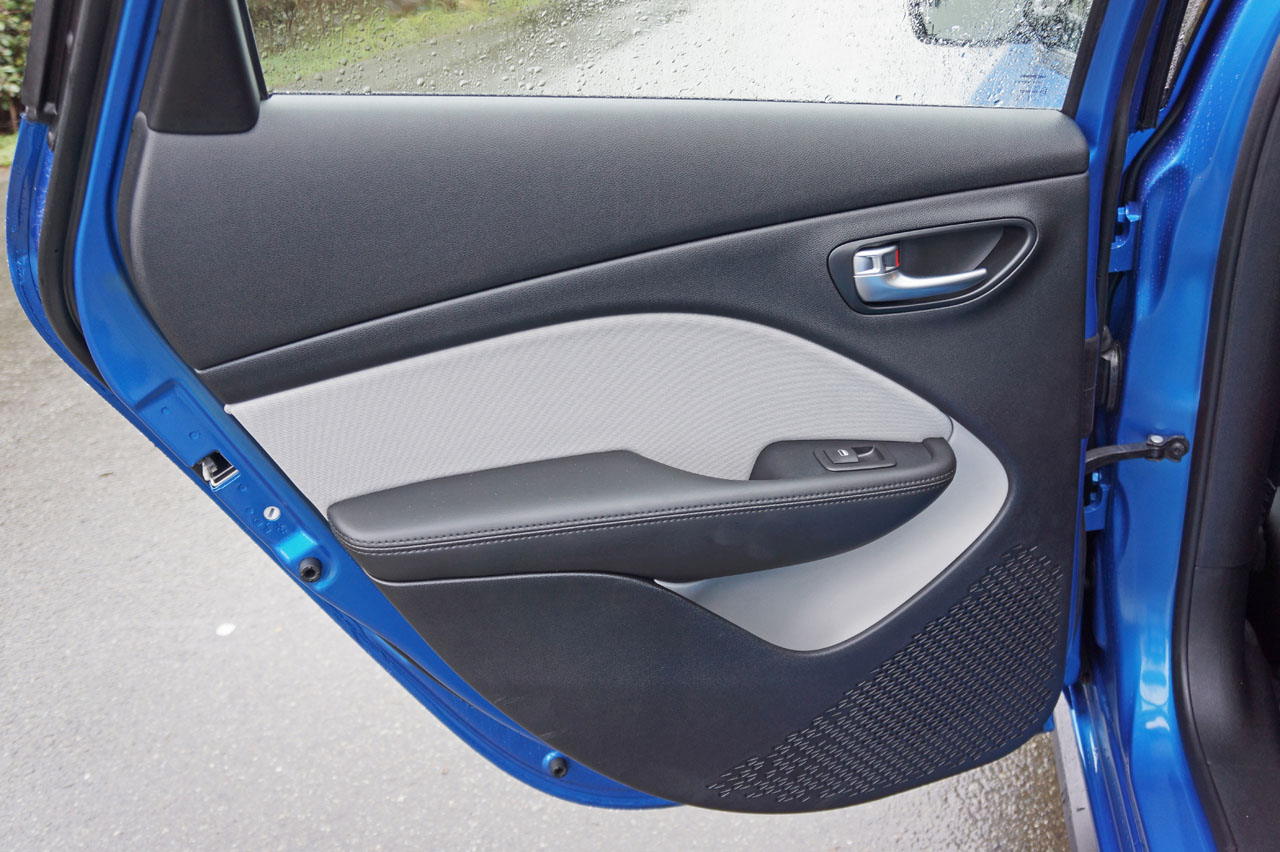 each panel, which is quite nice looking, whereas the woven grey cloth inserts are padded from behind and attractive too, the leatherette door armrests are also nicely padded and stitched, plus large pockets down below accommodate water bottles and other items. The centre armrest is covered in leatherette too, albeit contrast stitched, while it opens up to a large bin featuring a 12-volt charger, aux plug and USB port.