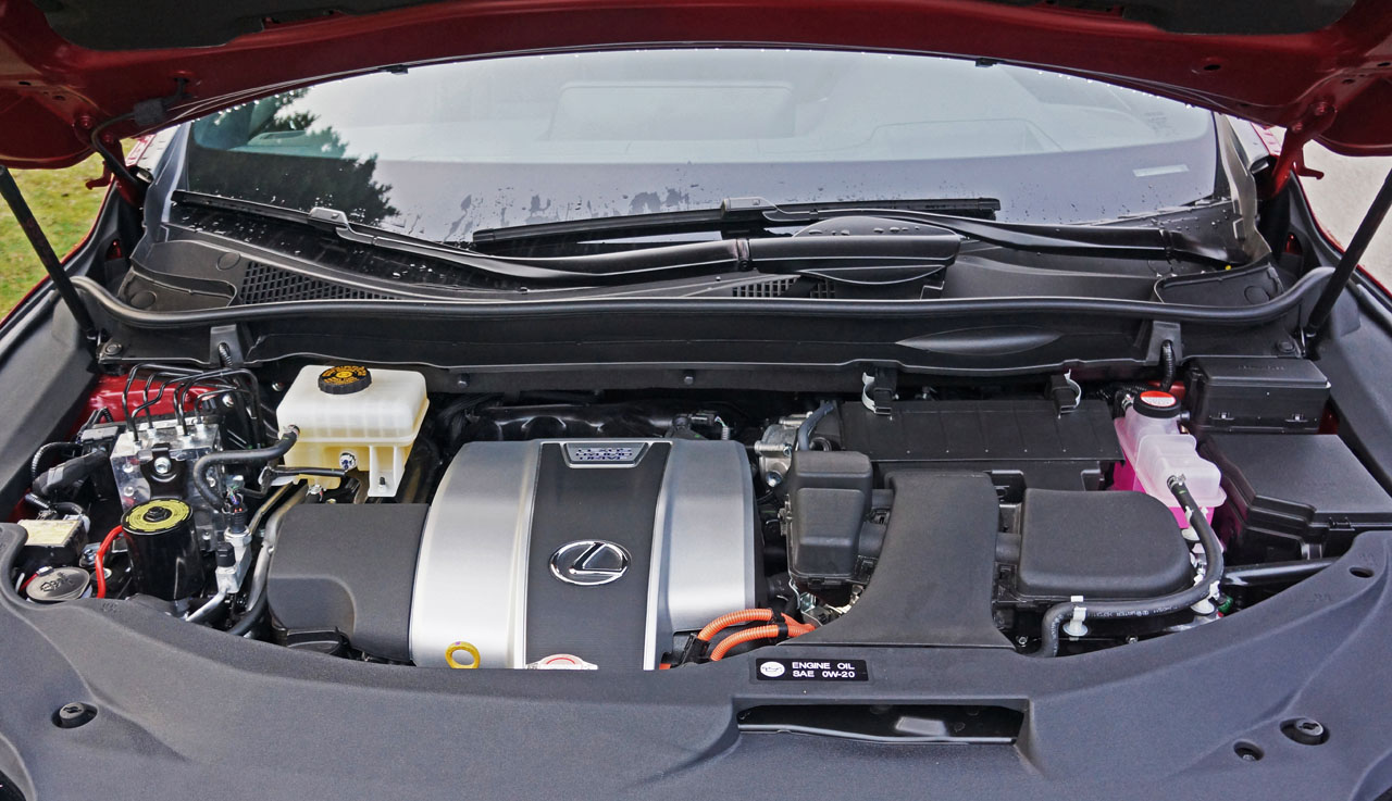 to 100km/h certainly amply fast for this class of SUV, or if you’re trying to maximize fuel economy like I was during the majority of my weeklong drive, leave it in regular or Eco mode and it comfortably whooshes away from standstill in electrified silence before the 3.5-litre V6 kicks in. The gasoline portion of the engine is based on the RX 350’s 3.5, but its Atkinson-cycle is more efficient and tuning less energetic on its own, the RX 450h relying on electrical stimulation to the front and rear wheels (and thus all-wheel drive) plus an efficient continuously variable transmission to bring about similar performance to its conventionally powered sibling.