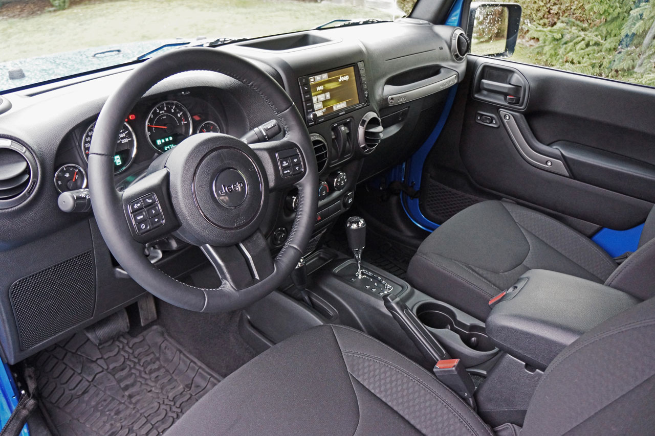 tank and transfer case skid plates, a Dana 30 solid front axle and Dana 44 heavy-duty rear axle, a 3.21 rear axle ratio (a 3.73 rear axle ratio is available), a 160-amp alternator, 600-amp maintenance-free battery, front and rear stabilizer bars, a tilt steering column, steering wheel-mounted audio and cruise controls, variable intermittent wipers, Uconnect infotainment with eight-speaker audio and an auxiliary input jack, a 12-volt auxiliary power outlet, temperature and compass display, sliding sun visors with mirrors, a full-length floor console, Jeep’s padded “Sport Bar” roll bar with integrated stereo speakers overhead, cloth upholstery, a height-adjustable driver’s seat, a front passenger seat that provides easy access to the rear seating area, a rear seat that tumbles up against the front seatbacks for a flat loading floor (but the seatbacks won’t simply fold down and lock into place), cargo tie-down loops, covered storage under the cargo floor, a wash-out interior