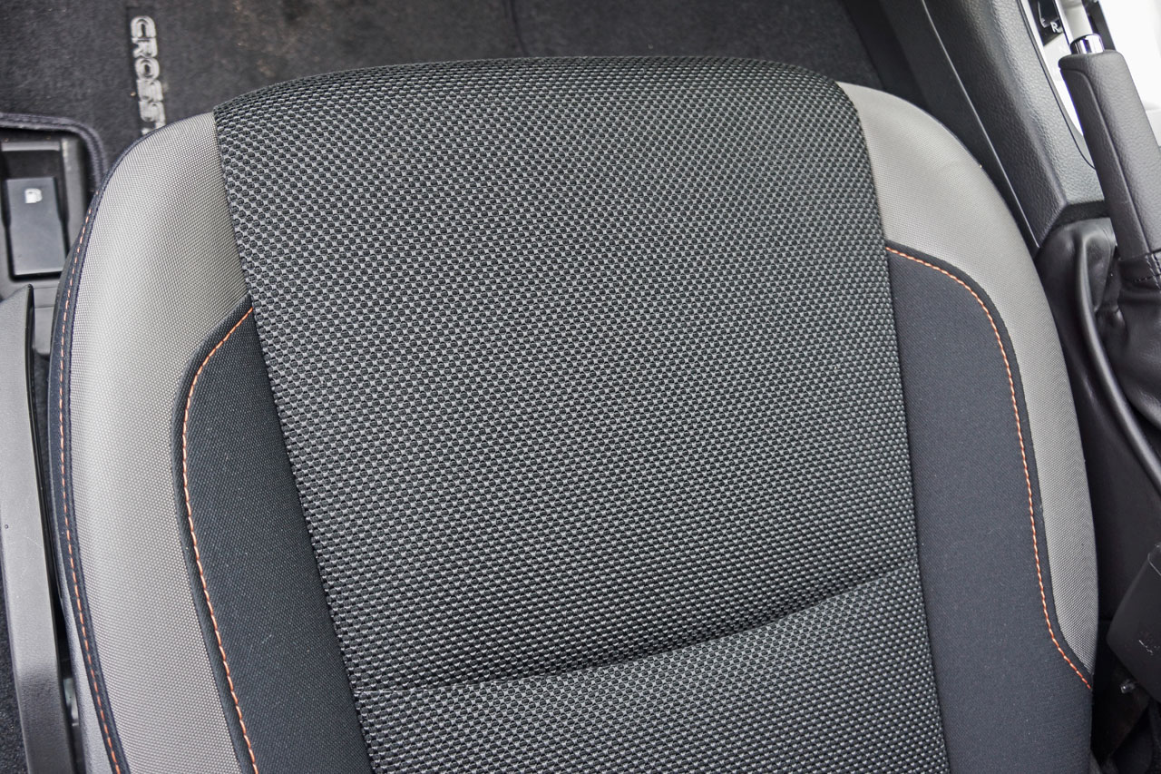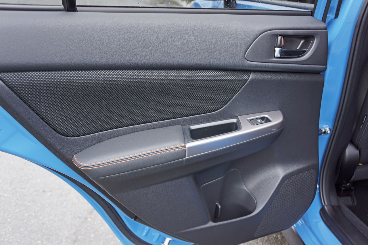 panel and door panels, while the door inserts are made from a plush woven fabric that matches the seat inserts. The padded leatherette armrests on the doors and at centre feature cool orange stitching that pulls cues from those sport seats as well as the leather-wrapped steering wheel and leather-clad shifter, while there are even designer clothes-style orange tags sewn onto the seats embroidered with the Crosstrek nameplate.