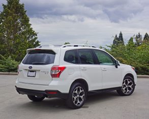 course there’s much more to the 2.0XT Touring than styling, with additional features including a large rooftop spoiler overtop a powered liftgate with programmable maximum height, so you won’t scratch it on the ceiling or a low hanging pipe in your parking garage, plus a cabin that’s upgraded with dual-zone automatic climate control. I should probably mention that along with the items already noted the Touring benefits from features found on lesser Forester models, such as auto on/off headlamps, a windshield wiper de-icer, a tilt and telescopic leather-wrapped multifunction steering wheel, a leather-wrapped shift knob, a sunglasses holder, a comfortable 10-way powered driver’s seat, heatable front seats, great sounding six-speaker audio with HD radio, USB and aux inputs, voice activation,