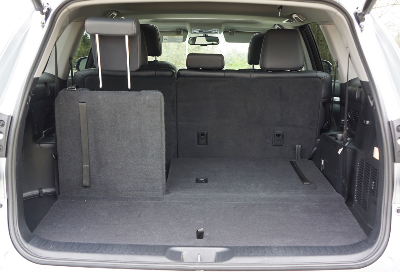 would be space, the front row as accommodating as most could hope for, the second row ultra-large with loads of legroom, and the third row comfortable enough for my five-foot-eight medium-built body with about three inches above my head, ample elbowroom and enough of a gap under the second-row seats that my big clunky shoes fit without issue. Those second-row seatbacks tilt forward as the entire structure rolls forward allowing good access to the rearmost seats, while there’s a decent amount of cargo space left in back when all seats are in use. For comparison purposes that number is 391 litres (13.8 cubic feet) as-tested, whereas flipping down the rear headrests and tugging on a strap atop each third-row seat will quickly expand that volume to 1,198 litres (42.3 cubic feet). Flattening the second row isn’t quite as easy, the process first requiring you to lift the lever at the base of the seat that normally