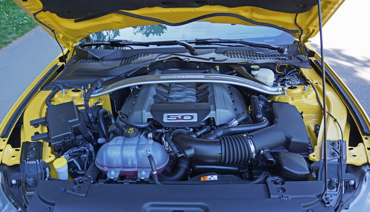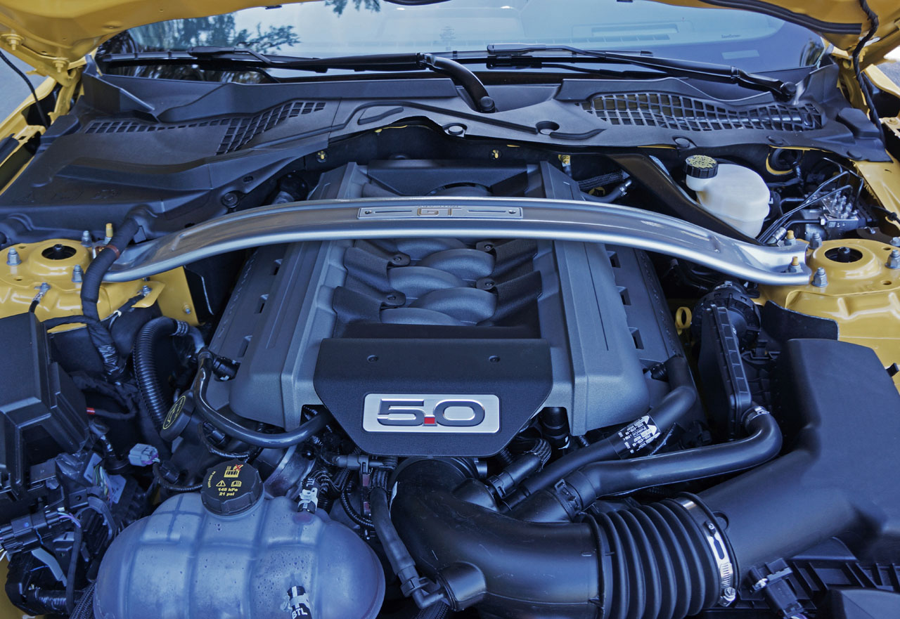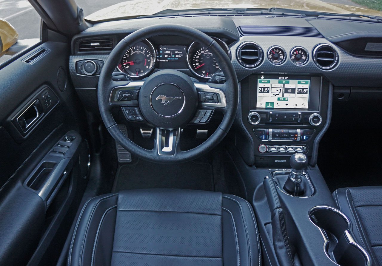 coast is ideal for dropping the top and ripping up the asphalt. The GT’s big 5.0-litre V8 produces noise that piques the ears and turn heads quickly, that is if my tester’s bright yellow paint hadn’t already seared their eyes. This car attracts attention in my city as easily as any mid-engine exotic, not to mention most Porsche 911s and BMWs. No wonder Mustangs sell so well.