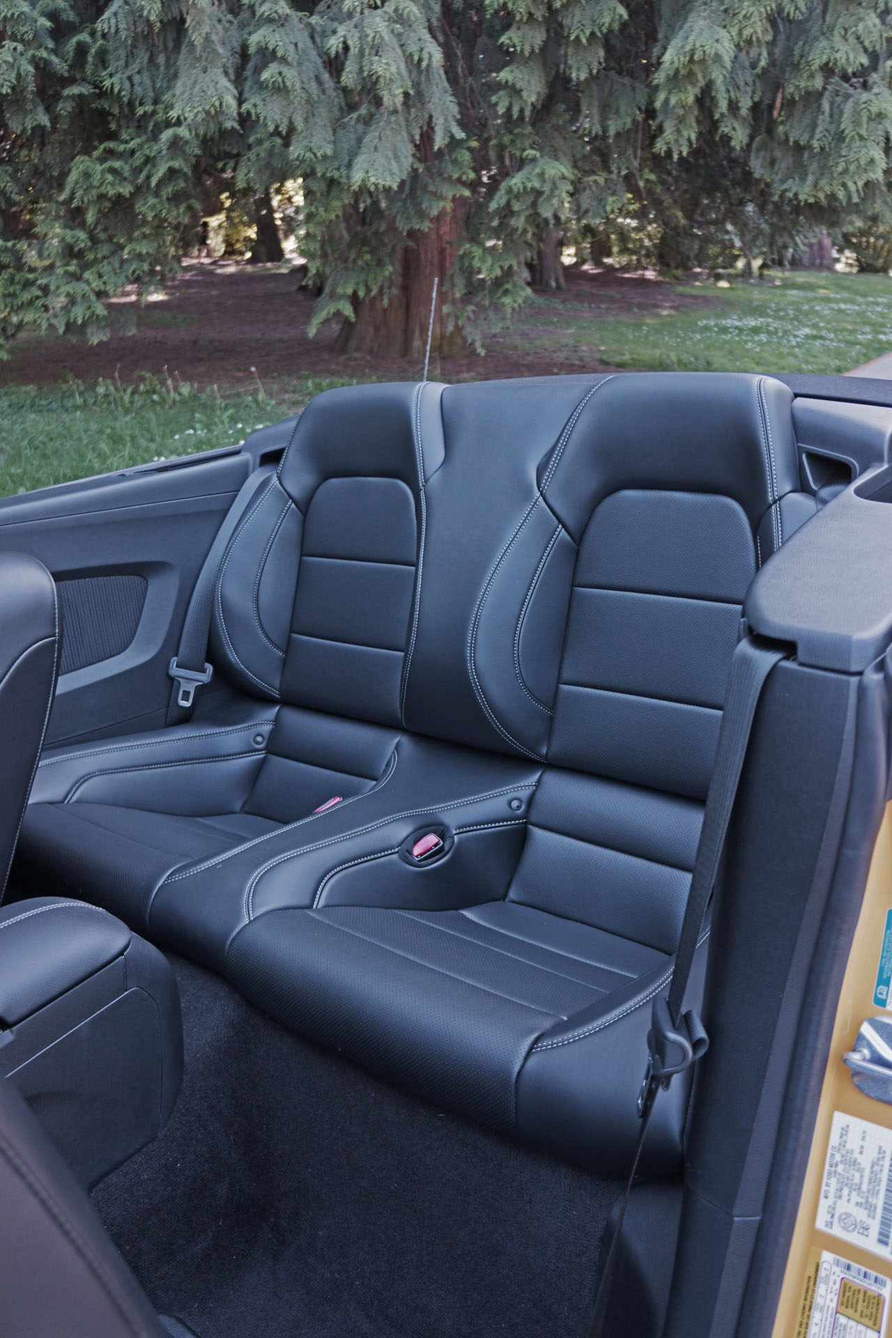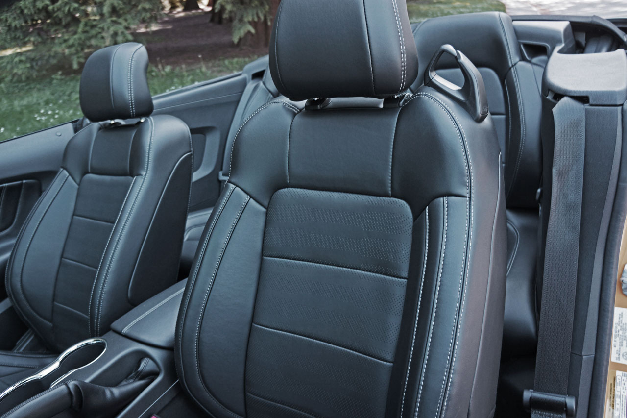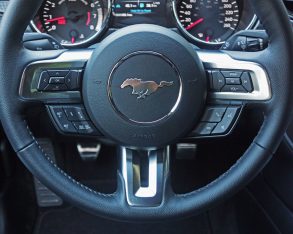 it could attract those offended by bargain basement cheapness, and the powers that be responded by producing a GT cabin, at least, that’s up to snuff with the luxe crowd. It’s not exactly 4 Series but most of its switchgear is better than a 911, while it’s finished with more pliable plastic surfaces than previous pony cars, particularly over the two protruding dash top segments and some of the instrument panel, not to mention the tops of each door. The padded door inserts are covered in contrast-stitched perforated leatherette to match the sport seats, albeit the latter are real leather and their perforations aid in breathability as well as three-way forced ventilation. They’re three-way heatable too, but with the sun beaming down it wasn’t like adding warmth was high on my priority list.