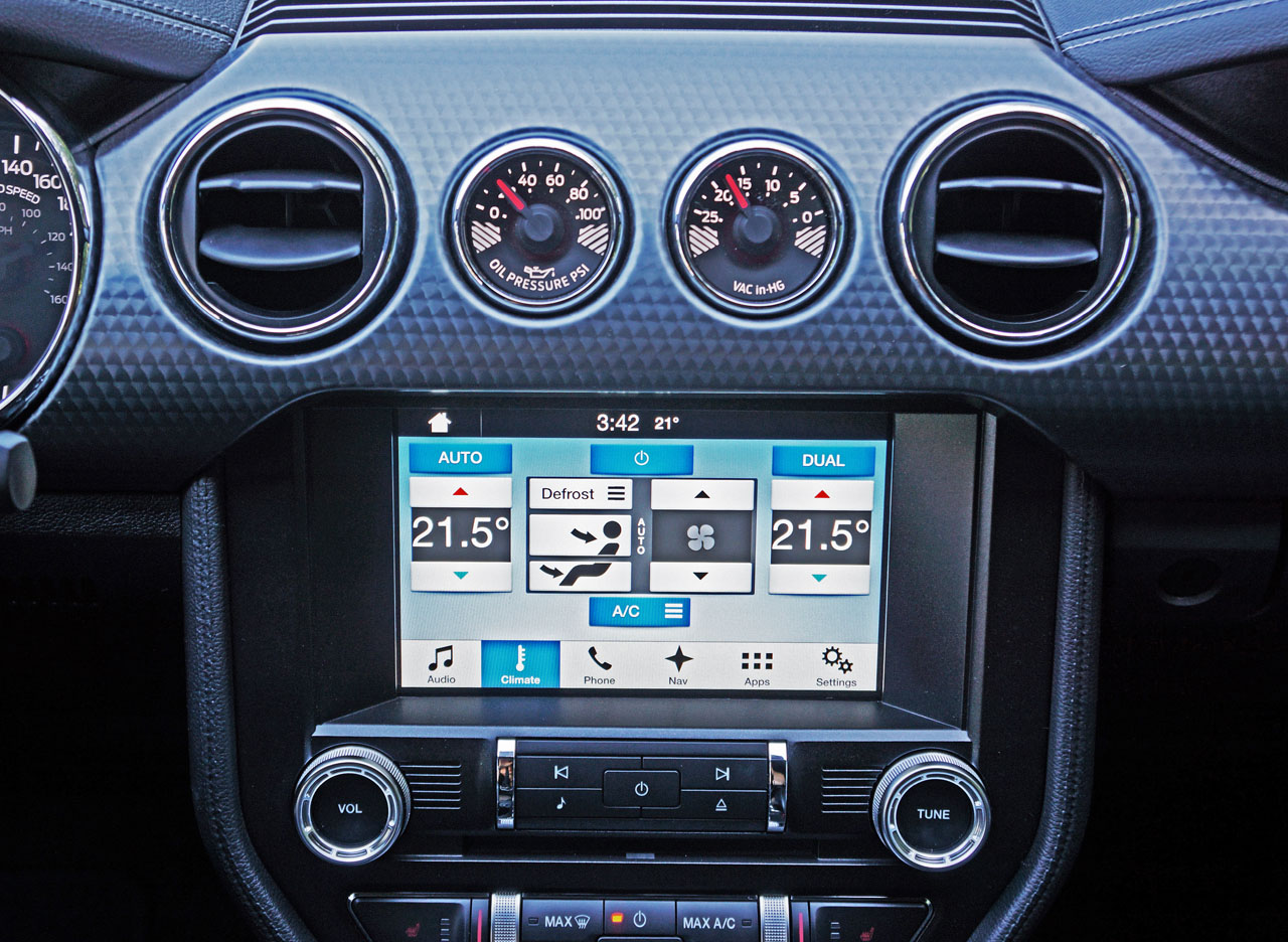 As it is, Premium is standard trim with the GT so the soft touch door uppers, aluminum pedals, dual-zone auto HVAC, heated/cooled leather seats and selectable steering/drive modes mentioned earlier are included, as are HID headlights, LED DRLs and sequential LED taillights, plus Pony projection lights under the side mirrors, illuminated sill plates, ambient lighting, powered seats, enhanced security and superb Sync 3 infotainment, this year’s big upgrade that singlehandedly reestablishes Ford as an electronics leader thanks in part to Apple CarPlay, Android Auto, loads of downloadable apps and super stylish, quick responding graphics.