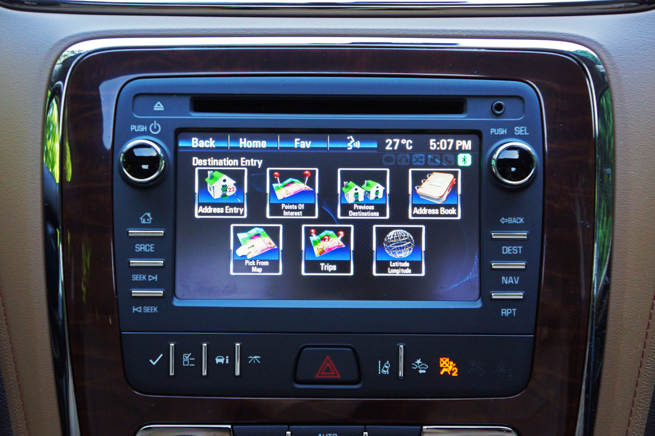 the positive a beautiful big rear glass sunroof duplicated the light emitting efforts of the one up front, a good thing as the Enclave’s interior is a true delight from a visual perspective. I suppose you’ll need to be a lover of traditional American luxury, as there’s plenty of nice dark chrome trim and what looks like an entire rainforest leveled to fit out its decorative inlays, but not to worry as it’s easily recognizable faux wood trim everywhere but the steering wheel. It’s an attractive but old school look that won’t be to everyone’s liking, nor will its dated dash digitals, especially the trip computer amid the otherwise attractive primary gauge package, but the infotainment system on the centre stack should meet most buyers’ expectations.