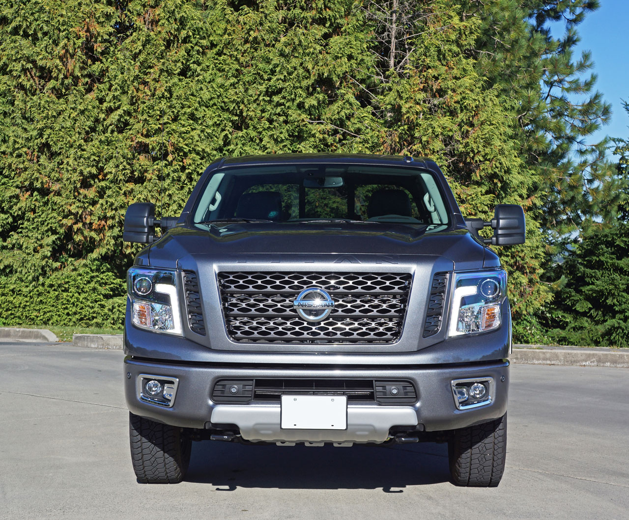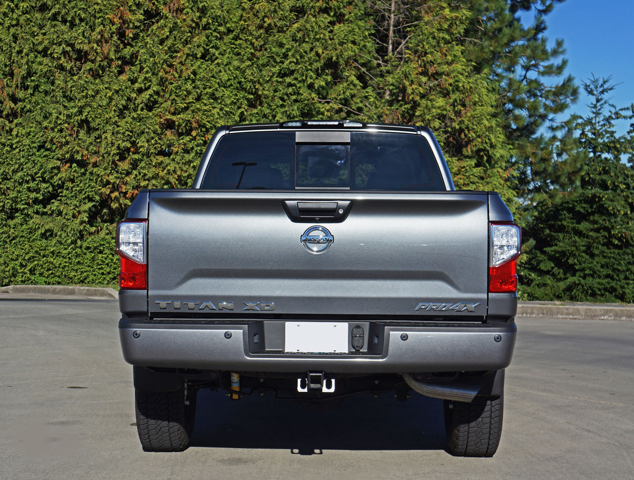 275/65R18 General Tire Grabber APT all-terrain rubber (a relatively quiet A/T tire with good four-season capability), plus an electronic locking rear differential, Bilstein off-road performance shocks, transfer case and lower radiator skid plates, a body-color grille, bumpers, and wheel arches (Gun Metallic painted front and rear bumpers plus side cladding on certain colors is a no-cost option), a factory-applied spray-on bedliner, auto on/off headlamps, fog lamps, LED DRLs, powered heatable side mirrors with integrated turn signals and puddle lamps, proximity access with pushbutton ignition, rain-sensing wipers, a leather-wrapped multifunction steering wheel, dual-zone auto HVAC, rear A/C vents, a 7.0-inch infotainment touchscreen with a rearview camera, navigation, voice recognition, mobile apps, and Siri Eyes Free, as well as a center console-mounted 110-volt power outlet, an eight-way powered driver’s seat, “PRO-4X” embroidered seatbacks, blind-spot warning, rear cross-traffic alert, and more.