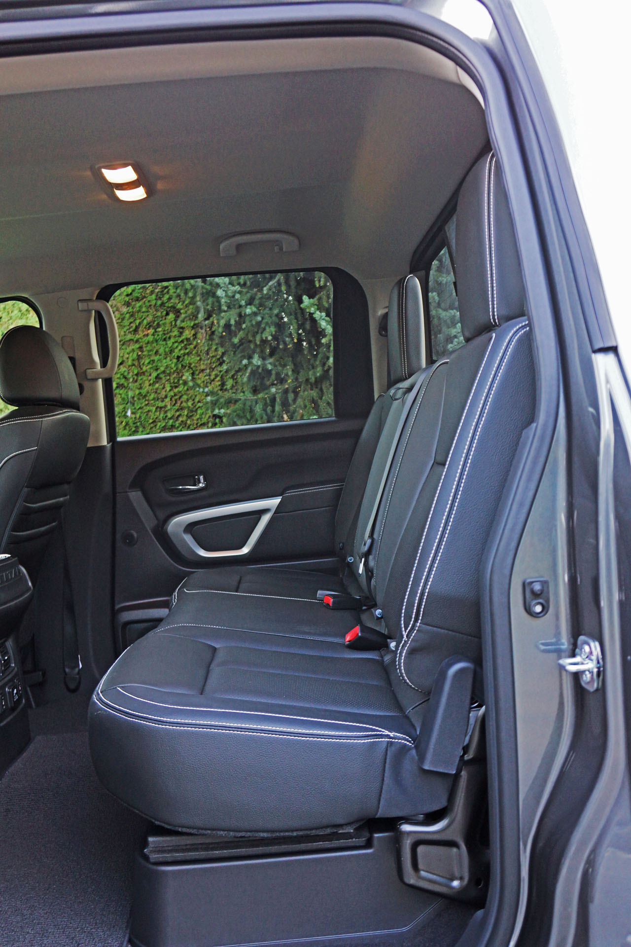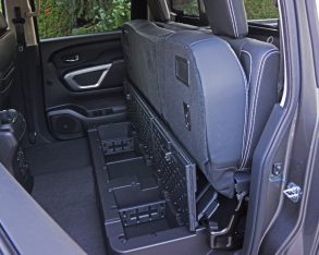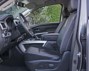 trim throughout the cabin, the exoskeleton-like lower console a real piece of art, while at eye-height a rich looking padded and contrast-stitched leather dash top closely matches the leather-wrapped steering wheel, side and center armrests and seat upholstery, the leather feeling very upscale with perforated inserts to allow three-way forced ventilation on hot days. This, and the three-way seat heaters can be set via the same high-quality chrome-trimmed rotating knob used in other top-line Nissan models, while the rest of the Titan’s switchgear is at least as good as most challengers, but its chrome-rimmed knobs aren’t wrapped in nice grippy rubber like some rivals.