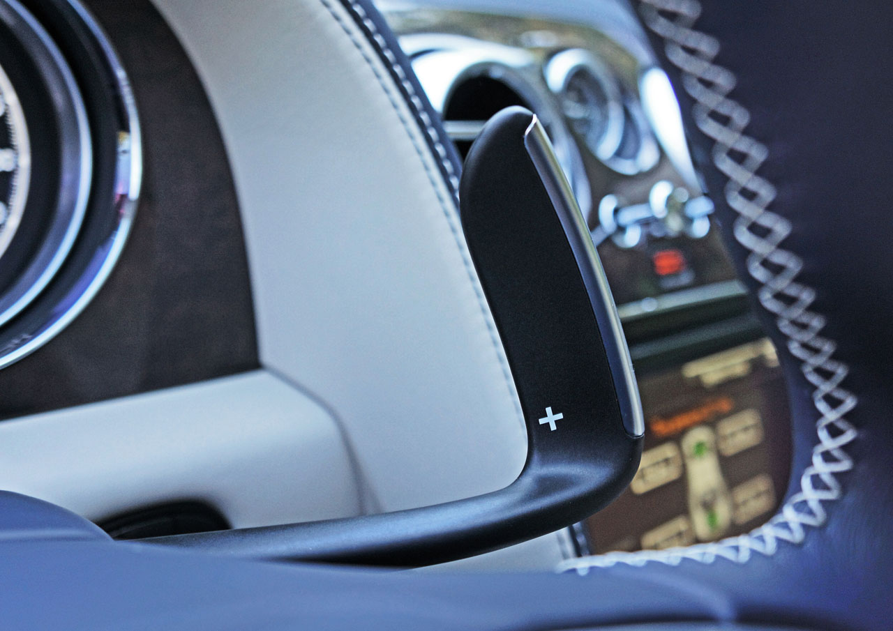 certainly wouldn’t be my first consideration, nor for that matter its superb performance. Call me shallow, but I’m absolutely smitten by its exterior design. Where its few peers and myriad pretenders continually brighten their ever-enlarging grilles and add yet more chromed glitz all-round, the Flying Spur seems to downplay its pedigree, as if it was raised in Kensington yet taught to be mindful of those in Hackney. Of course it hails from Crewe, a quaint railway town in the county of Cheshire, 254 kilometers north of London, but despite its rural roots it’s certainly civilized, with only the faintest of chromed edgings around its modestly sized black-mesh grille, the latter set between an elegantly penned quad of LED-enhanced headlamps, all hovering above an ideally simple body-colour and black-mesh lower fascia.