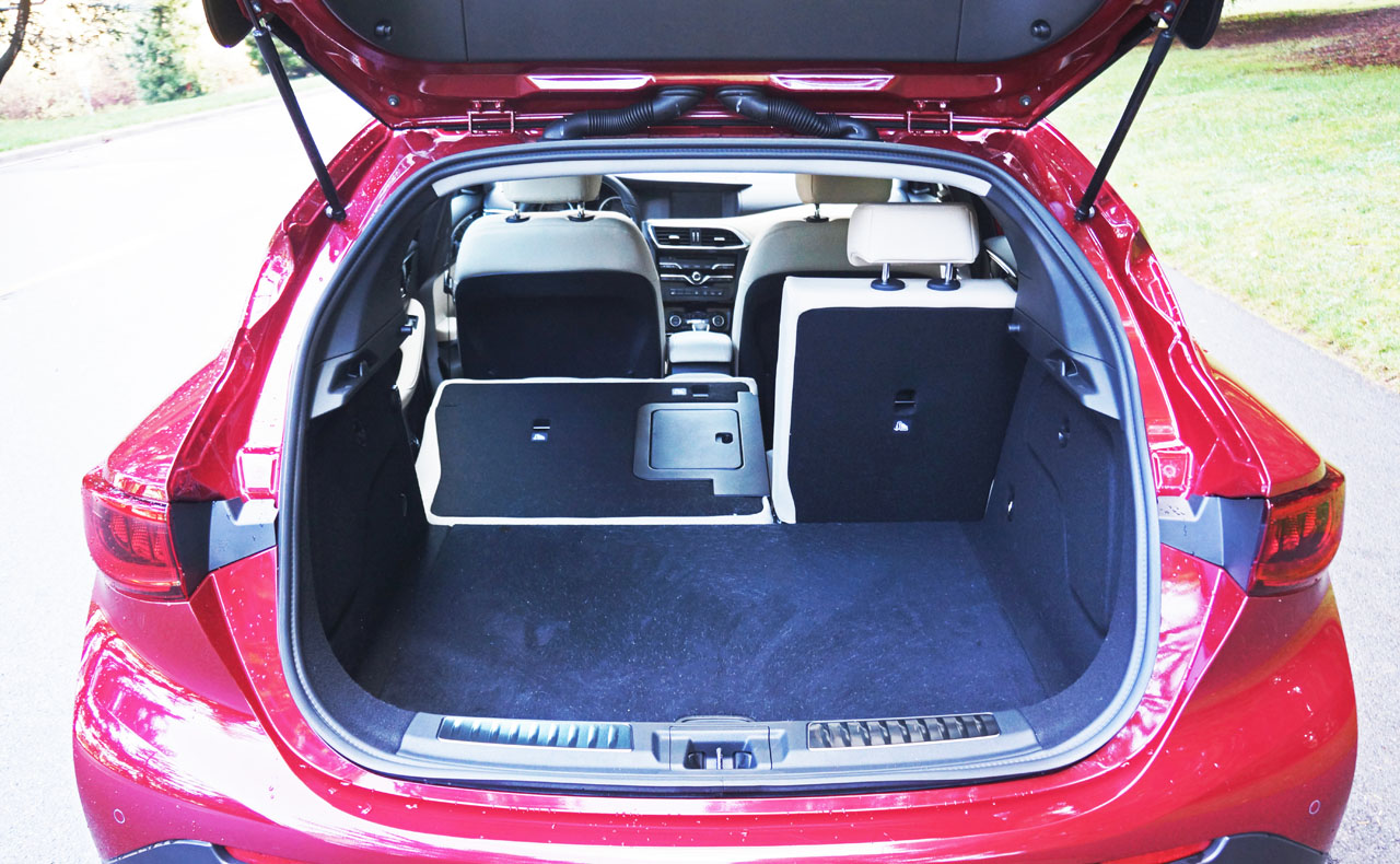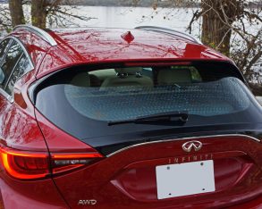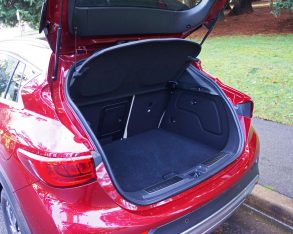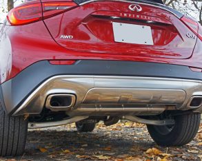 If the opportunity arrives I’d really like to test out the $46,490 QX30 Sport as it not only includes both Premium and Technology packages, but also boasts 19-inch alloys on 235/45 summer performance runflats, a 1.5-centimetre drop in ride height, seven-percent stiffer springs, a flat-bottomed sport steering wheel, sport seats with more aggressive side bolstering, larger more capable brake rotors that are cross-drilled up front with Infiniti-branded calipers, a gloss black grille insert, unique front and rear bumpers and lower fascias, and dark chrome dual exhaust finishers, all of which should make it more fun to live with and drive.