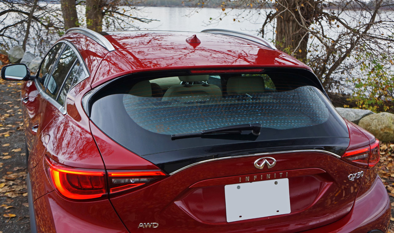 The as-tested $38,490 QX30 AWD is equipped identically to the base model other than the addition of its own unique front and rear fascias, different 18-inch alloys, three centimetres-plus of added ride height, gloss black mirror housings, and roof rails, while my loaner included the optional Premium package as well as a $2,500 Technology package that adds LED headlights with dynamic cornering and auto high beams, enhanced LED interior lighting, adaptive cruise control, a superb 360-degree surround parking monitor with moving object detection, semi-automated parking,