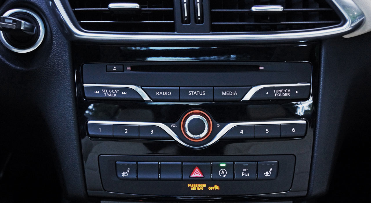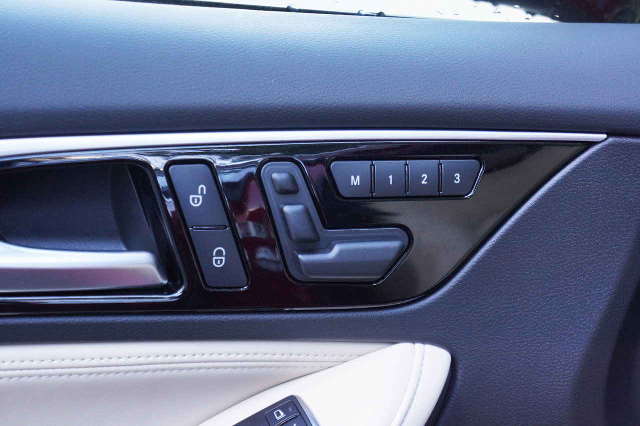 with puddle lamps, reverse dipping and driver-side auto-dimming, an auto-dimming interior mirror, a leather-wrapped multi-function steering wheel, cruise control, dual-zone auto HVAC, 7.0-inch touchscreen infotainment with a rotating dial controller surrounded by quick access buttons on the lower console, a reverse camera, Bluetooth phone and audio streaming, and a six-speaker AM/FM/CD stereo with satellite radio and two USB inputs, while Nappa leather upholstery, heatable eight-way powered front seats with memory for both seats and mirrors, and all the usual active and passive safety equipment also come standard.