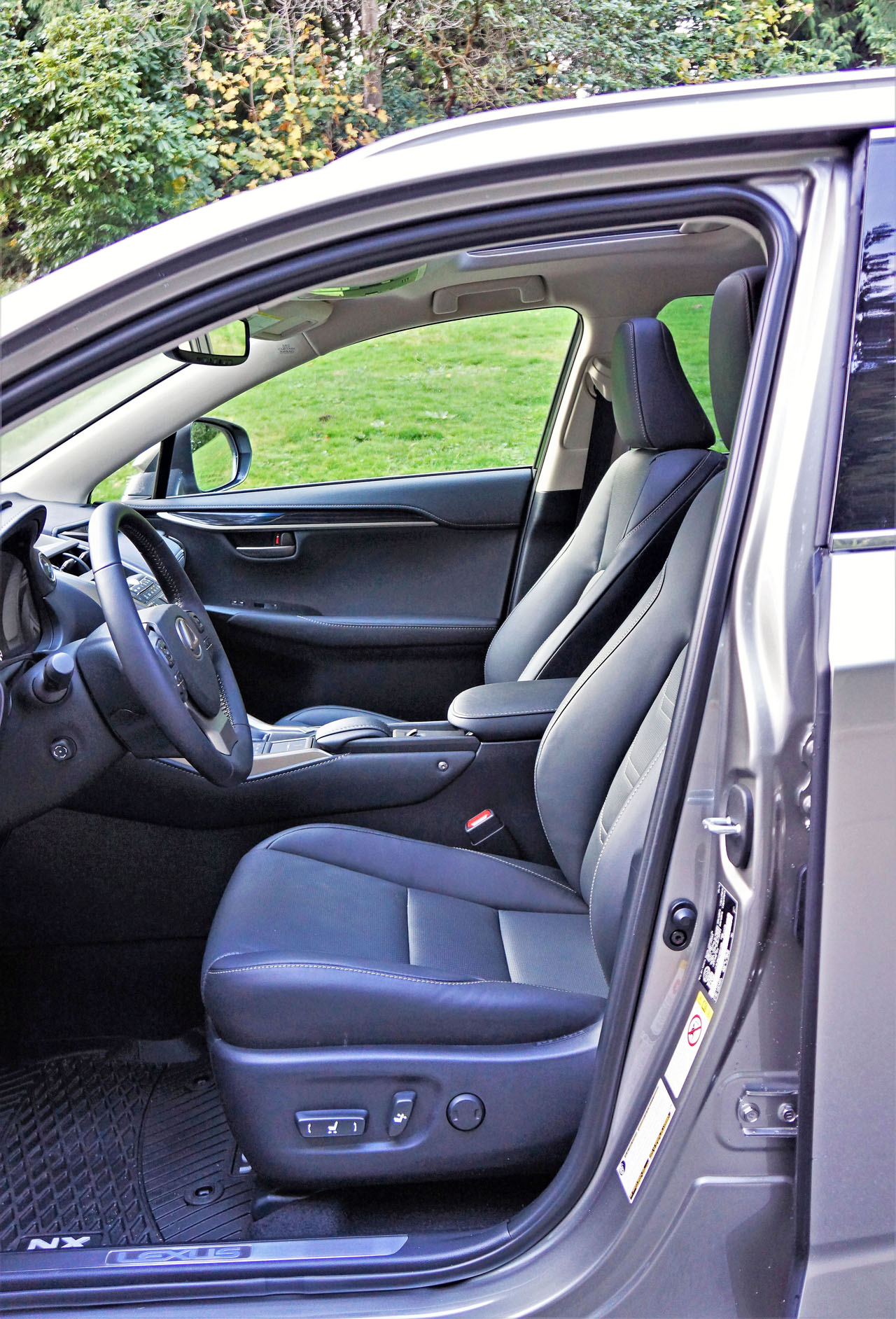 inside the base NX 300h includes pushbutton ignition, a heatable leather-wrapped multifunction steering wheel, a powered tilt and telescoping steering column, a colour TFT multi-information display, NuLuxe leatherette upholstery, heated and cooled power-adjustable front seats with driver’s side memory, an auto-dimming rearview mirror, dual-zone auto climate control, touchscreen infotainment featuring a reverse camera with active guidelines and navigation, a 120-volt household-style power outlet, an integrated garage door opener, a powered moonroof, a powered tailgate, hill start assist, all the usual active and passive safety features including airbags for the driver’s knees, and more.