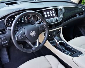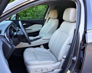 This in mind, most rivals use genuine aluminum or hardwood inlays across the instrument panel and doors, so I was also disappointed with Buick’s choice of faux wood, despite being denser than most of the fake woodgrain it’s used in the past. Truly, I almost believed it was real, so I suppose we can give them a partial pass for looking legit while saving trees. Then again, my top-line tester’s leather upholstery was a bit low rent for the premium class, at least as far as suppleness goes. What’s more, Buick wraps the front roof pillars in fabric yet doesn’t apply this de rigueur luxury feature anywhere else, so once again the Envision doesn’t measure up to the class average.