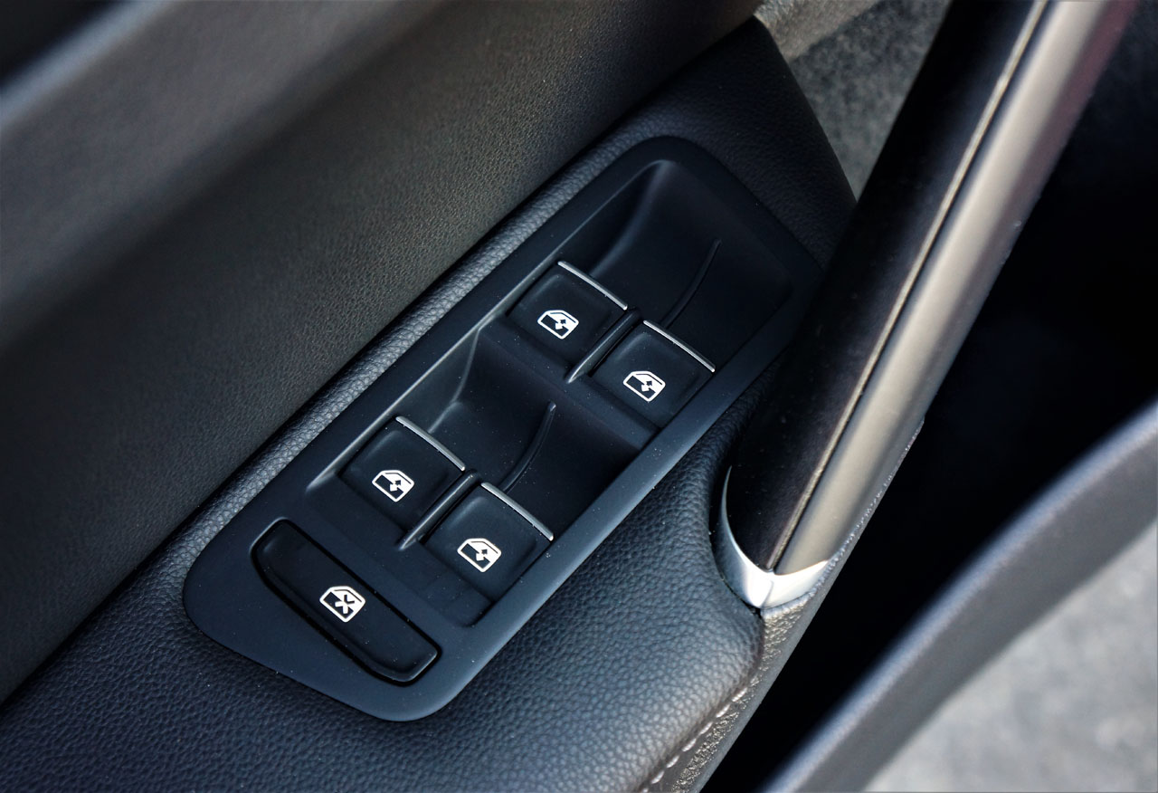 packed full of everything already mentioned as well as a six-speed DSG dual-clutch automatic with manual mode, auto on/off headlamps with static cornering capability, fog lights, powered and heated side mirrors with integrated LED turn signals, proximity keyless access with pushbutton ignition, ambient LED interior lighting, a leather-wrapped steering wheel, shift knob and handbrake lever, rain-sensing wipers, cruise control, an auto-dimming rearview mirror, Bluetooth phone connectivity with audio streaming, voice activation, two SD card slots, navigation, a rearview camera, 400-watt Fender premium audio, satellite radio, USB port, dual-zone auto climate control, leather upholstery, a 12-way powered driver’s seat, heatable front seats, a really nice powered panoramic sunroof, variable cargo load floor, a 115-volt household-style power outlet in the cargo area, etcetera.