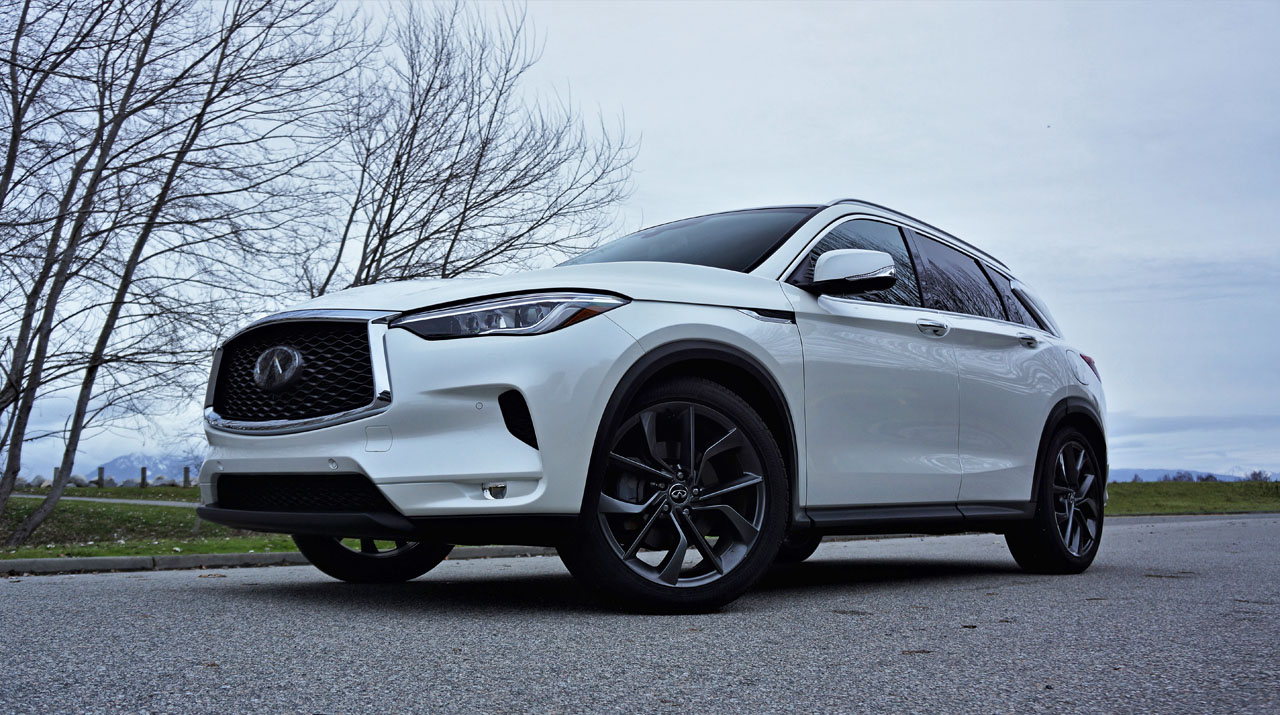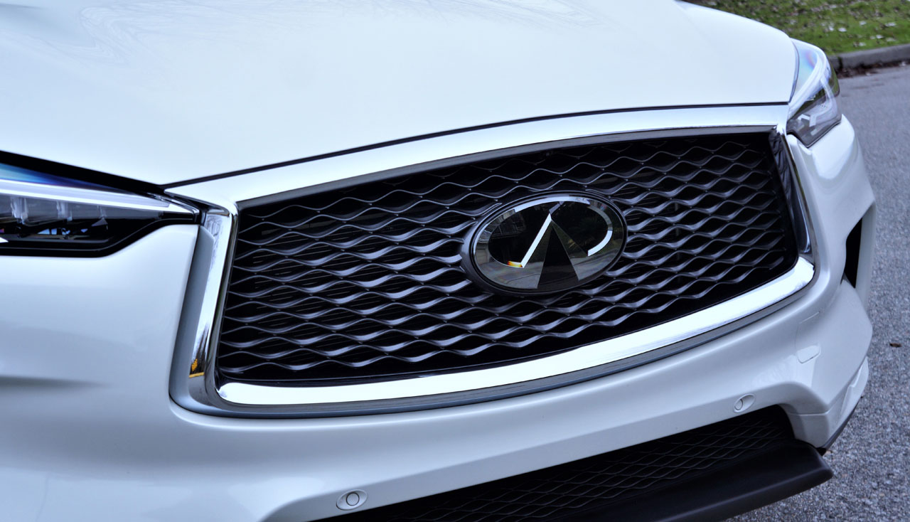 Along with AWD, even base Luxe trim comes well equipped with 19-inch alloys on 235/55 all-season run-flat tires, LED high/low beam headlights, LED signature daytime running lights, LED fog lamps, LED integrated turn signals on outside mirror housings, LED taillights, chrome-accented exterior door handles, dual chrome exhaust tips, remote engine start, proximity-sensing keyless access with pushbutton ignition, drive mode selector with standard, eco, sport, and personal settings, Infiniti’s InTouch dual display infotainment system featuring an 8.0-inch monitor on top and a 7.0-inch touchscreen below that, InTouch safety, security and convenience services, dual-zone automatic climate control, a powered panoramic glass sunroof including a powered sunshade, a powered liftgate, predictive forward collision warning, forward emergency braking with pedestrian detection, blindspot warning, and more.