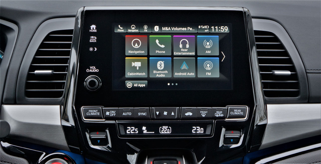 Before delving into everything that comes standard with Touring trim, I’ve just got to say how impressed I was with the Odyssey’s infotainment system. It starts with a fixed tablet-style design that sits above the centre stack like some premium brands do in their much higher priced models, and almost seamlessly melds the aforementioned piano black plastic surrounding trim with a black glass-like finish from edge to glossy edgy, its digital innards bright, colourful, with deep, rich contrasts, and it’s wonderfully easy to use thanks to a tile-style setup, not to mention tap, pinch and swipe gesture controls depending on the feature being used, navigation mapping being one that uses all. I was a bit surprised not to find a 360-surround parking monitor in top-line trim, but Honda’s excellent multi-angle rearview camera with dynamic guidelines comes standard, as does Apple CarPlay and Android Auto smartphone integration. I tried the latter and it was simple to set up and use, while route guidance was a no-brainer and totally accurate whether using Google’s phone-sourced directions or Honda’s proprietary system, my personal preference being the latter.