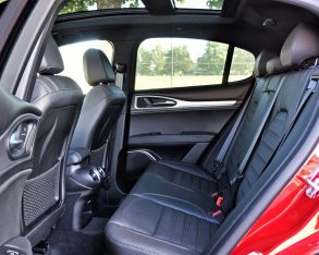Seating in mind, with the driver’s seat positioned for my height I sat behind and found it very comfortable and quite roomy with approximately eight to 10 inches ahead of my knees, plus more than enough room for my feet even when stretching out my legs, while there was also about three and a half inches above my head, and four to five inches beside my hips and shoulders. Alfa provides a flip-down armrest at centre, complete with dual cupholders. They even provided a slot between the two cupholders for holding a smartphone, very intelligent. There are two large vents on the backside of the front console for feeding air to each rear passenger, plus a duo of USB charging ports under these, while rear outboard seat heaters are available as well. The rear passenger compartment is very well finished too, and the panoramic glass sunroof overhead provides an open, airy ambiance.