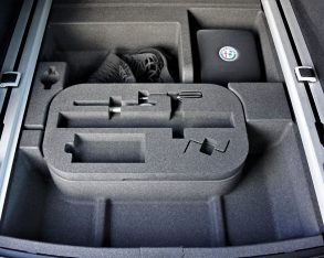 The rear liftgate is powered if you opt for the $500 Convenience package, and stops at pre-programmed heights, this one preset quite low so I kept bumping my head on it. Yes, I could’ve set it to lift higher, but to its credit I was easily able to push it higher manually. The retractable cargo cover is well made and fits nice and tight within its extended position, while the carpeting and finishing of the cargo area is quite good too. Alfa included a rail system in back, also part of the Convenience package, complete with movable hooks for clamping down gear, while the load floor in between can be lifted and removed, exposing a styrofoam compartment underneath. Levers for automatically lowering the 40/20/40 split rear seatbacks are provided to each side, the centre position needing to be folded manually from a pull-tab on top. I like the flexibility of the cargo area, the centre pass-through ideal for longer items like skis, and while a smidge smaller than the aforementioned Audi Q5 at 525 litres (18.5 cu ft) behind its rear seats and 1,600 litres (56.5 cu ft) when they’re fully flat, it should suffice for most peoples’ needs.