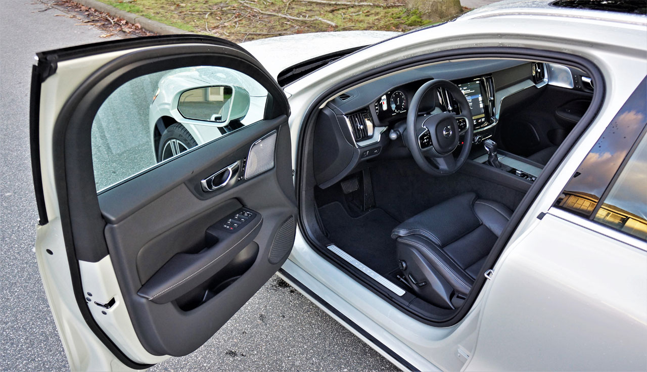 Option out a V60 Inscription T6 AWD and you can have the same $1,000 19-inch multi-spoke alloys as seen on my test car, the previously noted audio upgrade, $1,300 massaging front seats and a $1,150 graphical head-up display. Additionally, my tester included a $1,250 Climate Package with heated Aquablades windshield wipers, a much-welcome heatable steering wheel, and heated rear seats; a $1,500 Convenience Package with Volvo’s Pilot Assist semi-autonomous drive system that uses the Adaptive Cruise Control, Lane Keeping Aid and other advanced driver assistance features to keep the V60 within its chosen lane, plus a Homelink garage door opener and a compass; plus an $1,800 Vision Package with the aforementioned 360-degree surround parking camera, Park Assist Pilot semi-autonomous self parking, front parking sensors, auto-dimming side mirrors, and blindspot monitoring with rear cross traffic alert.