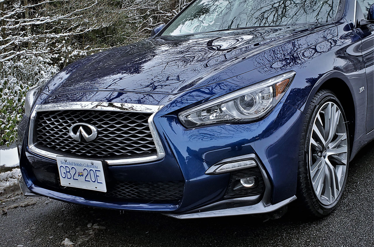 This Signature Edition wears the same standard 245/40R19 all-season run-flat performance rubber as the Sport model, but as it was my test car purposely featured winter M+S tires that without doubt impacted its lateral grip on dry sections of roadway. Just the same Infiniti didn’t go cheap on its winter tires, skinning the standard triple-five-spoke alloys in Pirelli Sottozero 3s, which showed such prowess through wet and snowy conditions that nothing nearing the likes of an SUV was at all necessary. In fact, it was so good at managing wet Left Coast snow that this Q50 quickly became my default ride for a very cold and soggy Vancouver week, while it was not only a great help in overcoming inclement weather, but its wonderfully reactive steering, wholly capable suspension, and smooth, comfortable ride made each stint behind the wheel a joy.