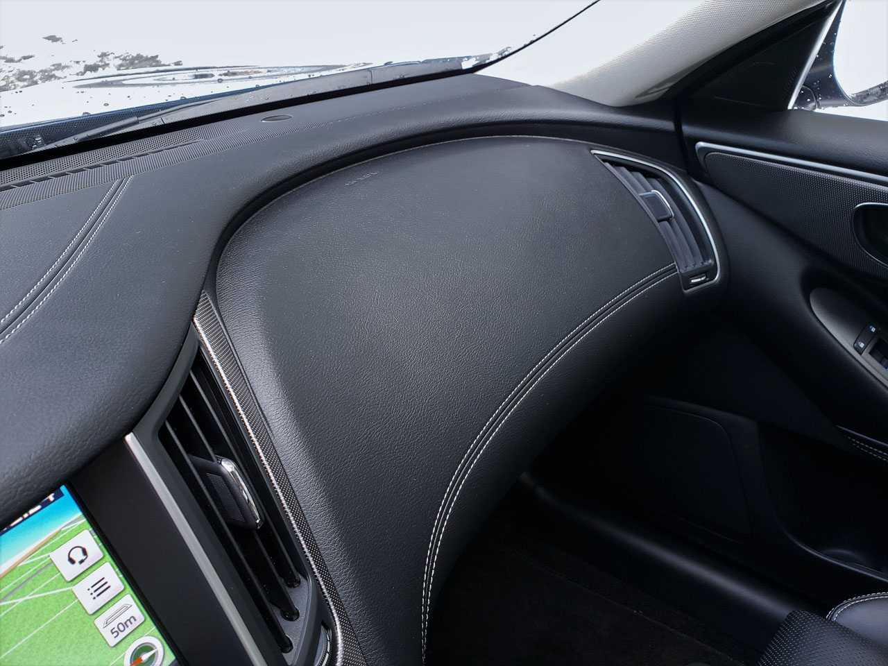 Features aside, all Q50 trims are finished to a very high level. My test model included stitched leather across the dash top, instrument panel, both sides of the lower console, and the upper two-thirds of each door panel, while the glove box lid boasts a high-quality soft composite too. The materials are superb as well, from that leather surfacing to the finely upholstered premium leather seats, to the gorgeous Kacchu aluminum inlays, the plentiful satin silver accents, and other surface areas, while all switchgear looks good with nice tightly spaced fitment, and feels substantial with proper luxury-level damping.