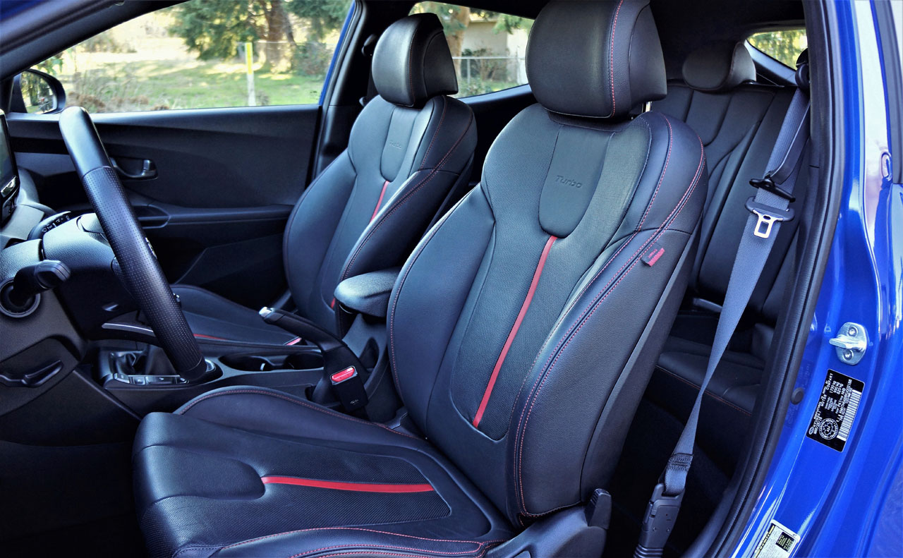 The base Veloster sports 18-inch alloys too, by the way, plus auto on/off headlights, LED daytime running lights, power-adjustable heated side mirrors, remote entry, a leather-wrapped heatable multifunction steering wheel, a tilt and telescopic steering column, cruise control, power windows, illuminated vanity mirrors, a sunglasses holder, filtered air conditioning, a one-inch smaller 7.0-inch infotainment touchscreen with standard Apple CarPlay and Android Auto, a rearview camera with dynamic guidelines, six-speaker audio, Bluetooth hands-free phone connectivity with audio streaming, a leather-wrapped shift knob, heated front seats, manual six-way driver and four-way front passenger seat adjustments, blindspot detection with rear cross-traffic alert, all the expected active and passive safety features, plus more.