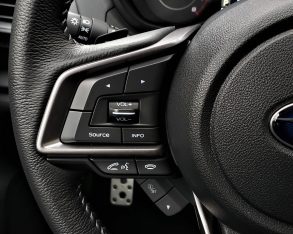 While a serious driver’s car, the Impreza is also extremely comfortable, and not just because of its just-noted ride quality. The driver’s seat offers good adjustability, but strangely no lumbar adjustment in this trim. Fortunately the seat design is inherently supportive, and thanks to excellent reach from the tilt and telescopic steering column I had no problem getting into a good position for optimal control of the leather-wrapped steering wheel and sporty metal pedals. The steering wheel is nicely shaped for a sporty, comfortable feel with the hands at the proper 9 and 3 o’clock positions, while ample switchgear on its spokes allow for control of audio, phone, cruise, and trip/multi-information display functions.