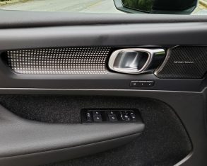 They’re attractive too, as noted earlier, with microsuede inserts, leather side bolsters, and nice light grey contrast stitching, plus piping on their outer edges. There’s even a tiny blue and yellow Swedish flag sewn on the insides of the backrest, just in case you were wondering where this car was designed and made.